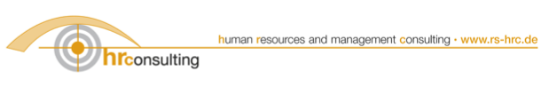 HR Consulting haftet nicht für direkte oder indirekte Schäden, die durch die Nutzung der Informationen oder Daten entstehen, die auf dieser Webseite zu finden sind. Rechte und Pflichten zwischen HR Consulting und dem Nutzer der Webseite oder Dritten bestehen nicht. Falls Sie Beratung durch uns wünschen oder unsere Dienstleistungen in sonstiger Weise in Anspruch nehmen möchten, sprechen Sie uns bitte individuell an.